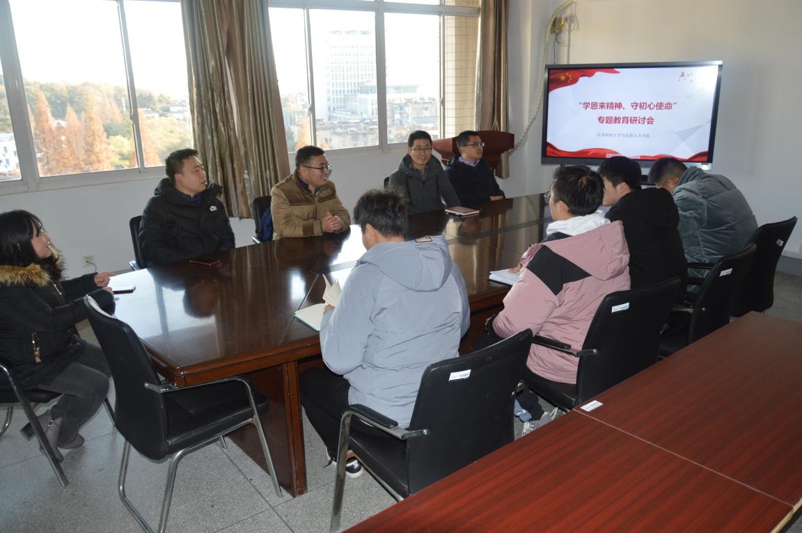 根据学校纪委“学恩来精神、守初心使命”专题教育活动工作部署,12月15日XK星空体育在实验综合楼805召开“学恩来精神、守初心使命”专题教育研讨会。研思政教研室周远全老师,马克思主义基本原理教研室李西杰老师,研究生教研室杨虎老师,毛中特教研室赵勇老师,郭红燕老师和科学技术史全体研究生参加会议。