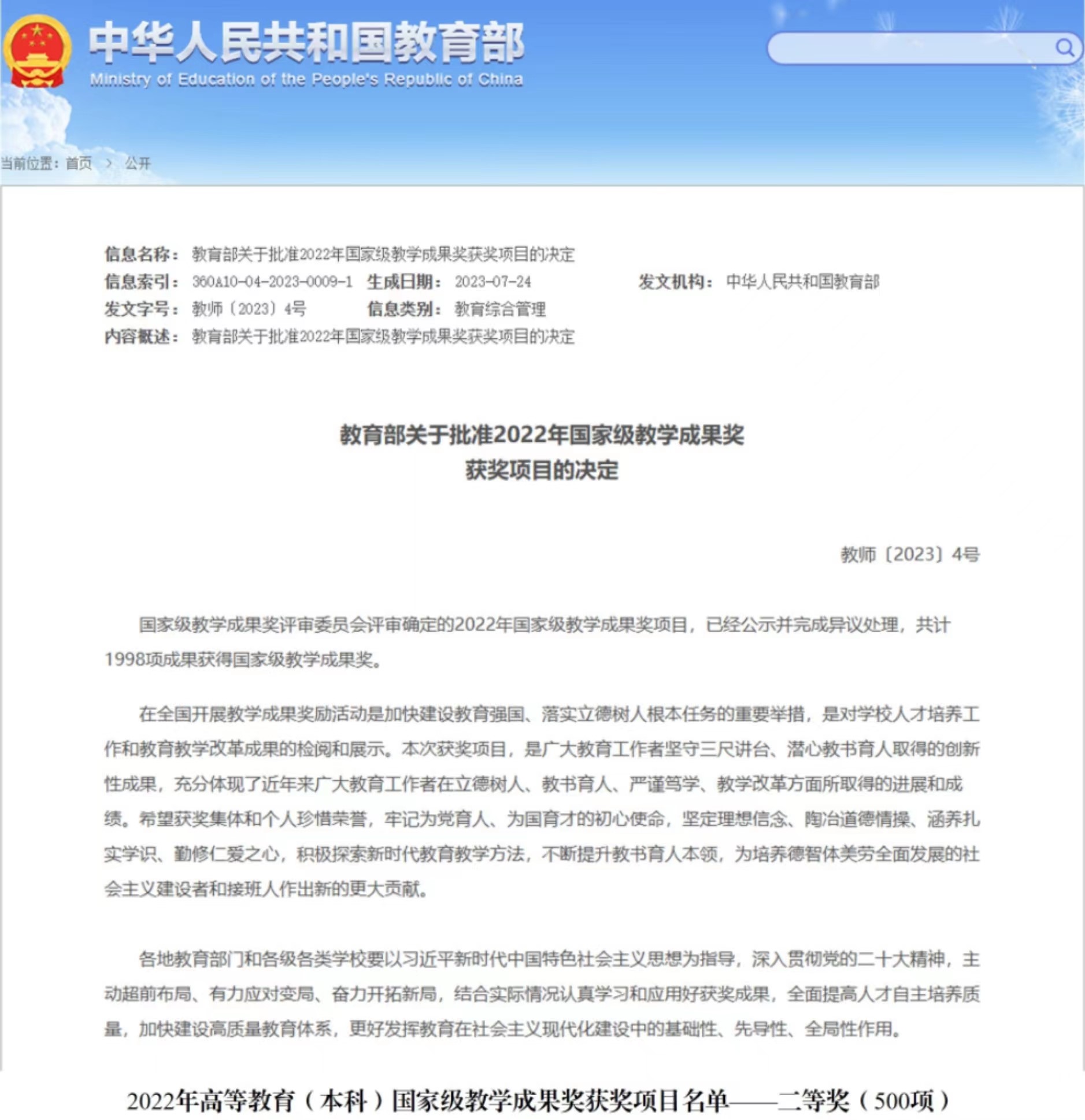 7月24日,教育部公布了《教育部关于批准2022年国家级教学成果奖获奖项目的决定》(教师〔2023〕4号)。我院《船海类高校大学生“1621”素质培养模式的构建与实践》成果喜获高等教育(本科)国家级教学成果奖二等奖,实现学院国家级教学成果奖的历史性突破。