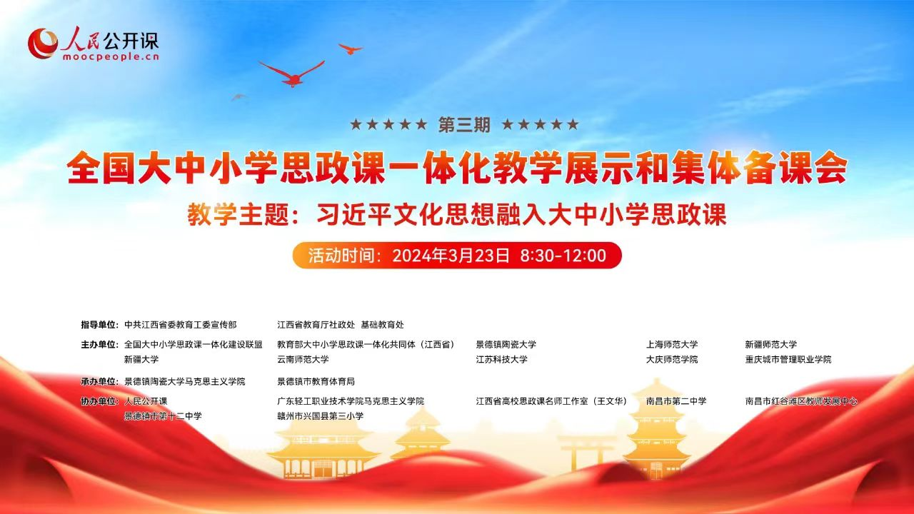 在习近平总书记学校思想政治理论课教师座谈会作出重要讲话5周年之际,3月23日上午,由我院参与主办的全国大中小学思政课教学展示和集体备课会(第三期)在景德镇陶瓷大学举行。会议的主题为习近平文化思想融入大中小学思政课。本次活动由全国大中小学思政课一体化建设联盟单位、教育部大中小学思政课一体化共同体(江西省)、景德镇陶瓷大学、上海师范大学、新疆师范大学、新疆大学、云南师范大学、星空XK、大庆师范学院和重庆城市管理职业学院联合主办,景德镇陶瓷大学XK星空体育和景德镇市教育体育局联合承办,活动全程由人民公开课直播。